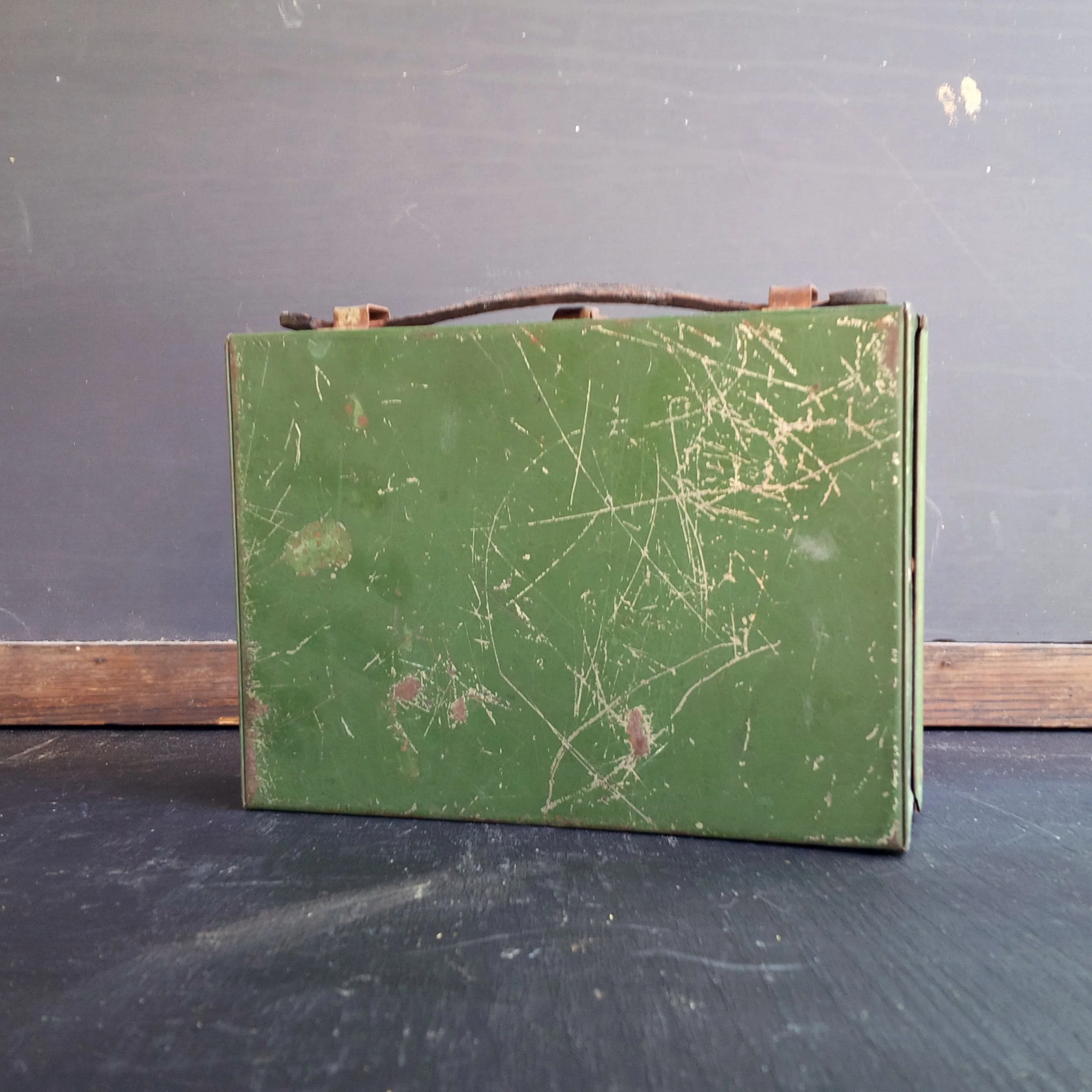 In fully functioning shape, the latch operates smoothly, the lid fits securely, and the leather handle is in strong condition. Just the right amount of scratch marks and light rust to give this guy a century's worth of unique character.