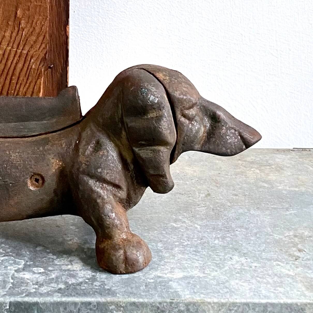 A very popular style, George is part of a long line of cast-iron Dachshund dog boot scrapers that have been manufactured and reproduced for decades throughout the 20th century. Available in all shapes and sizes, these long dog mud scapers were made all the way up to the early 2000s and even came in miniature form at just 6 inches in length. Sometimes, they were painted in colors, bright and bold, but most often came in dark brown or solid black. George is one of the originals made sometime before the 1920s and features a natural cast iron finish with lovely little age spots, here and there, in rusty shades of orange.