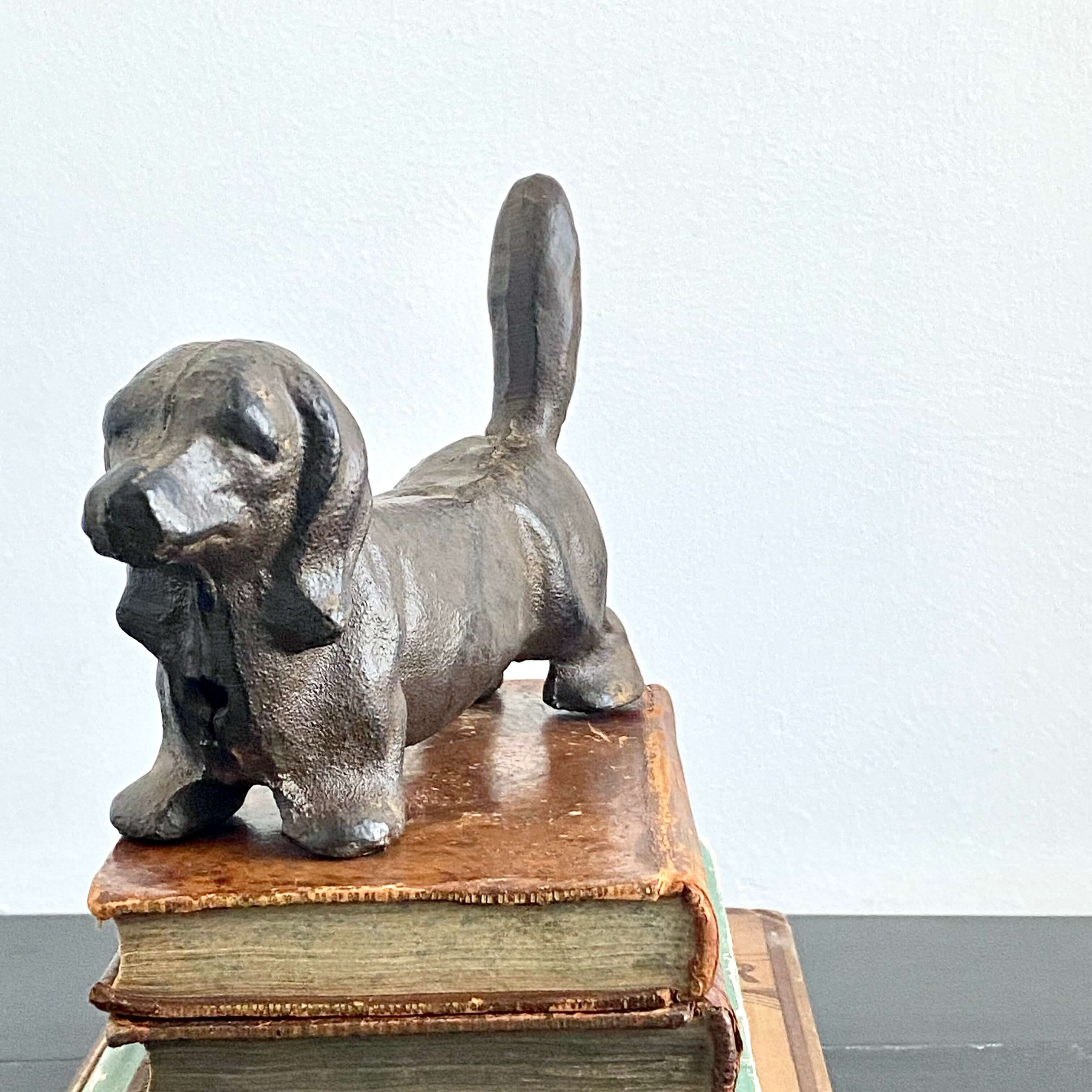 Although it's difficult to find similar siblings of Bronwyn's size and stature, she's most likely a reproduction of an earlier style of vintage and antique cast iron dog doorstops that have been popular pretty much since doors were invented. Like many found dogs, her ancestry is a little bit of a mystery. She could be all basseet hound or a combo of beagle and basset, otherise known as a bagle. Lineage aside, Bronwyn might not be ancient in age, but that is fine by us because she's passionate about history and has yet to meet an antique door that she doesn't not want to snuggle up with.