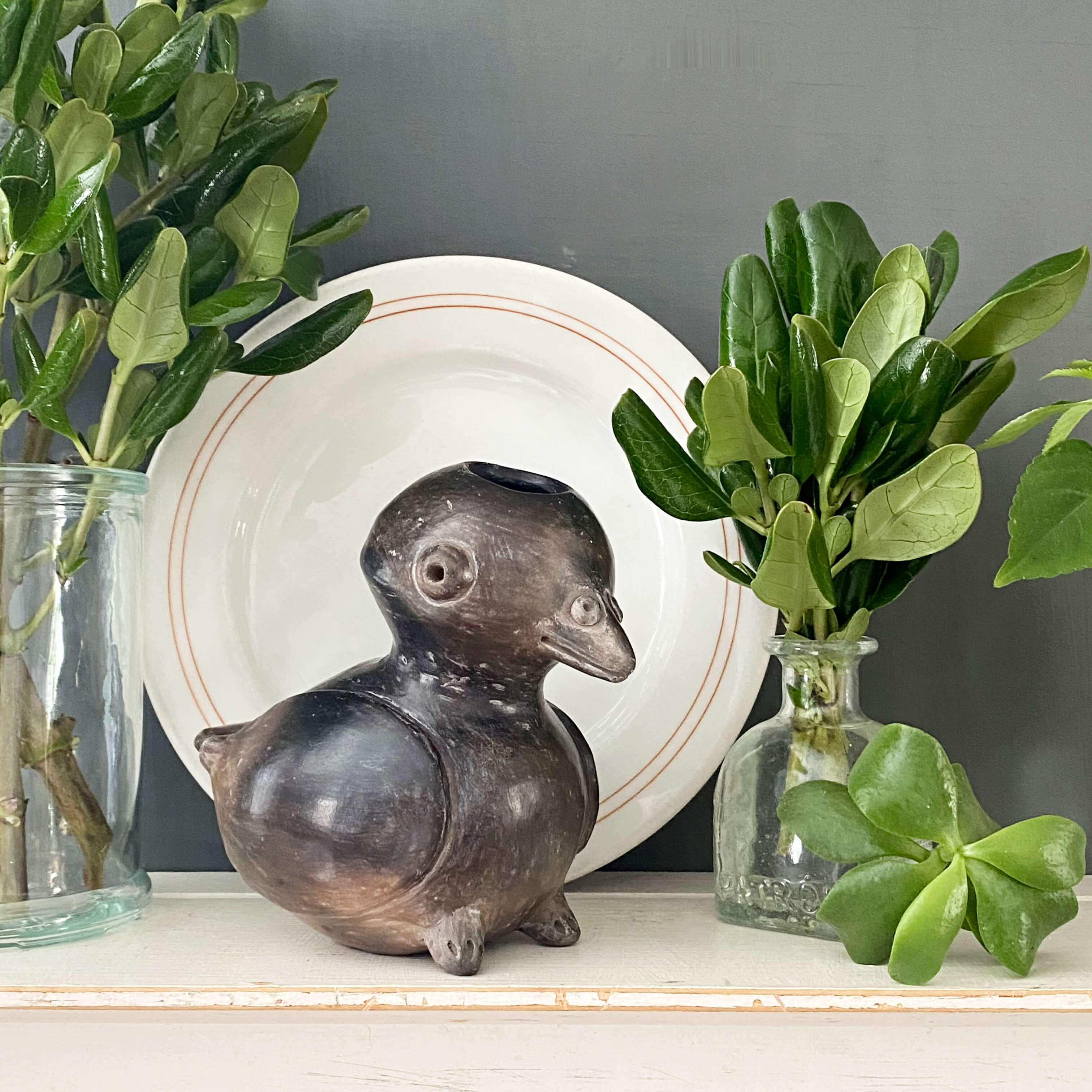 Handmade, most likely in Mexico this replica of an ancient Olmec blackware pottery effigy vessel depicts a bird with a beak, tiny feet, and bulging eyes. Full of character and modern-day charm, this bird represents a lengthy history of the Olmec civilization that dates back to Mexico between 1200 BC - 400 BC.