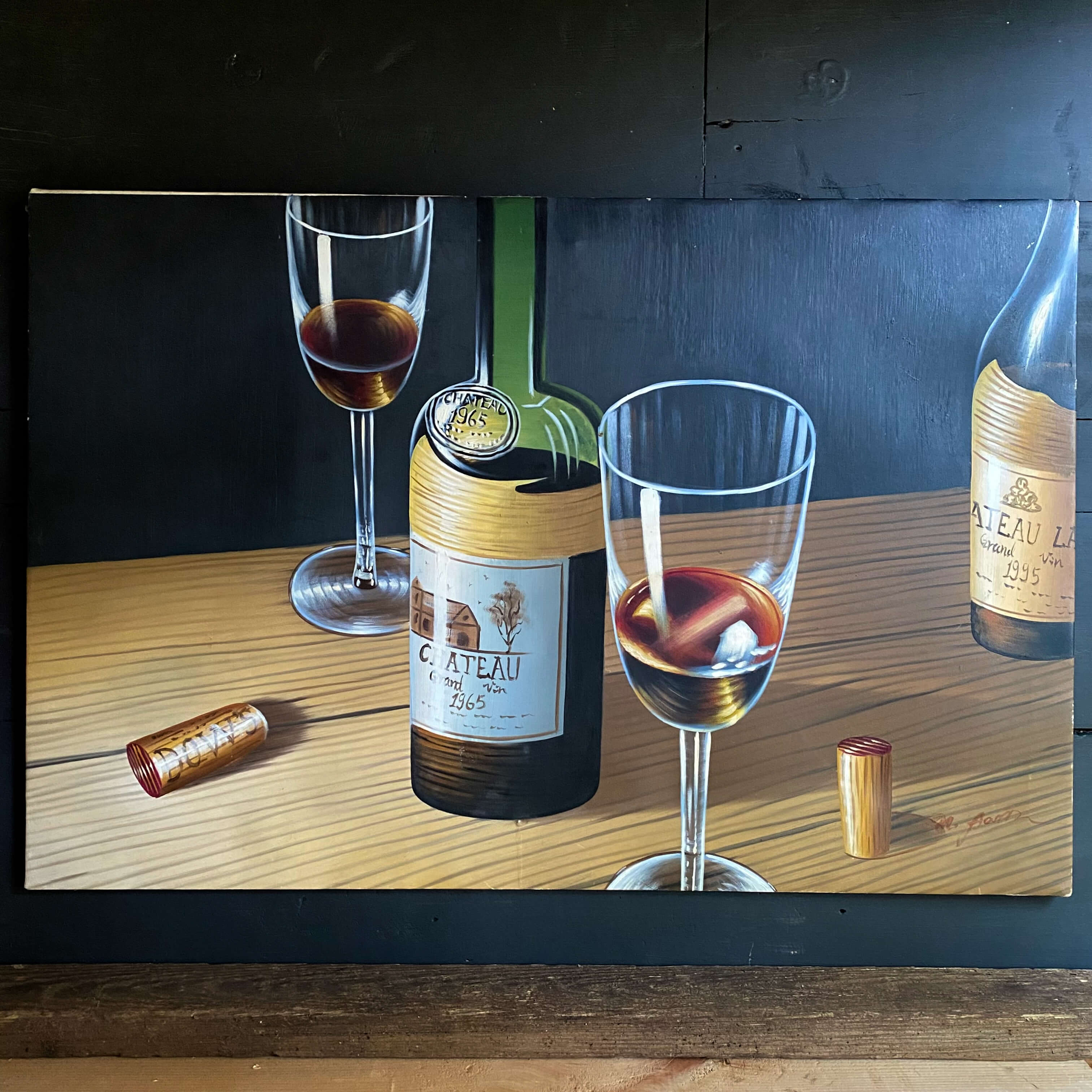The bottles themselves mirror labels from Chateau Latour, a winery in the Bordeaux region of France that dates back to the 1300s. One of the corks highlights the winery Dow's - a Portuguese vineyard dating to the 1920s that is well-known for its port wines. So while the painting is undated and most likely more contemporary in execution, there is a delightful nod towards 20th-century wine-making history.