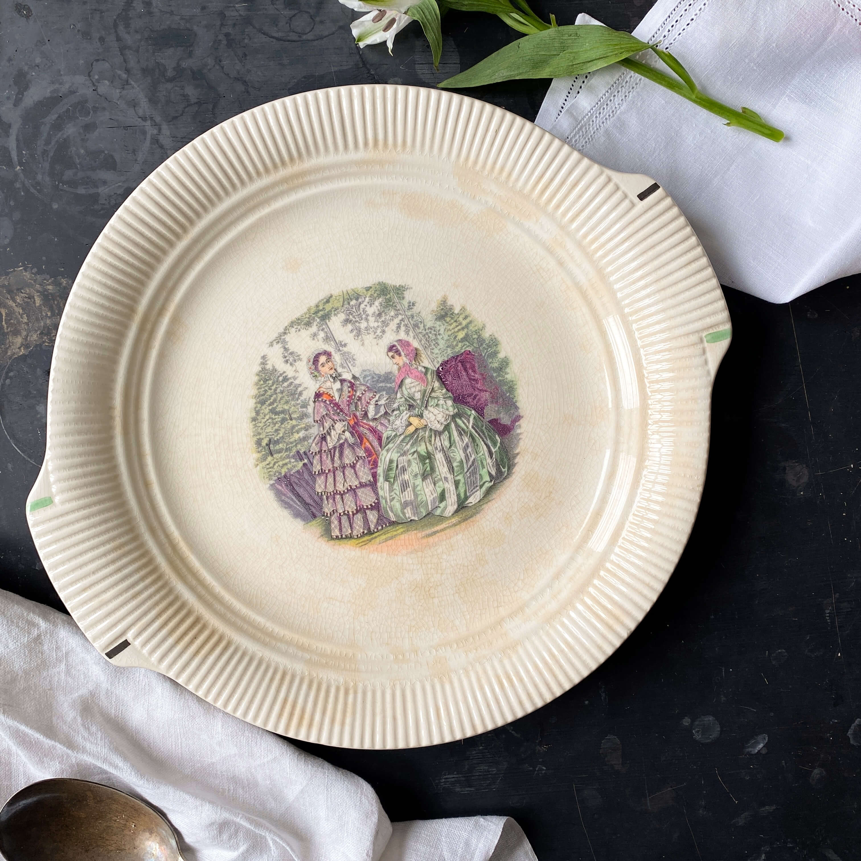 This hard-to-find Godey chop plate measures 13.5" inches from handle to handle and features two colorfully dressed ladies, (perhaps sisters!) chatting in a park-like setting. Originally designed for carrying large quantities of food, or bulkier items like steak or roasts, this plate's large size makes it suitable as both an artistic wall hanging and a piece of functional tableware. The bright purple and green colors of the ladies' gowns and setting are just gorgeous, especially in contrast to the natural tea-colored staining that has occurred over time.