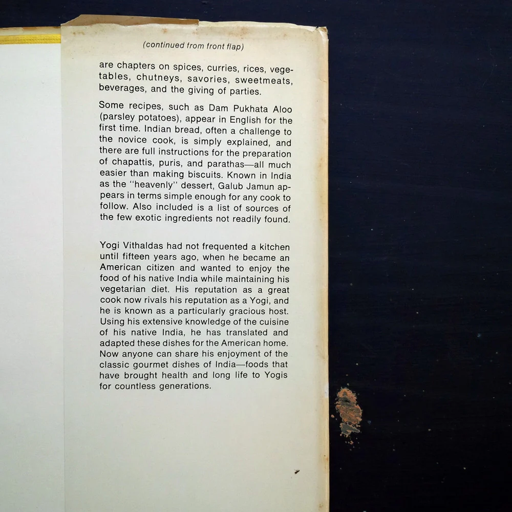 At the time Yogi Vithaldas wrote this cookbook he was living in New York City, so he understood the urban American lifestyle and its misconceptions with Indian food and the yoga lifestyle - that the food was too spicy and the yoga teachings too cosmic. He wanted to dispel these notions by showcasing good quality, healthy, delicious and attractive food from his homeland that would "happily nourish the body and court the soul." In a wonderfully engaging voice, he carries readers (and eaters) through his land of enticing, exotic cuisine via simple steps easily executable by all skill-level of home cook.