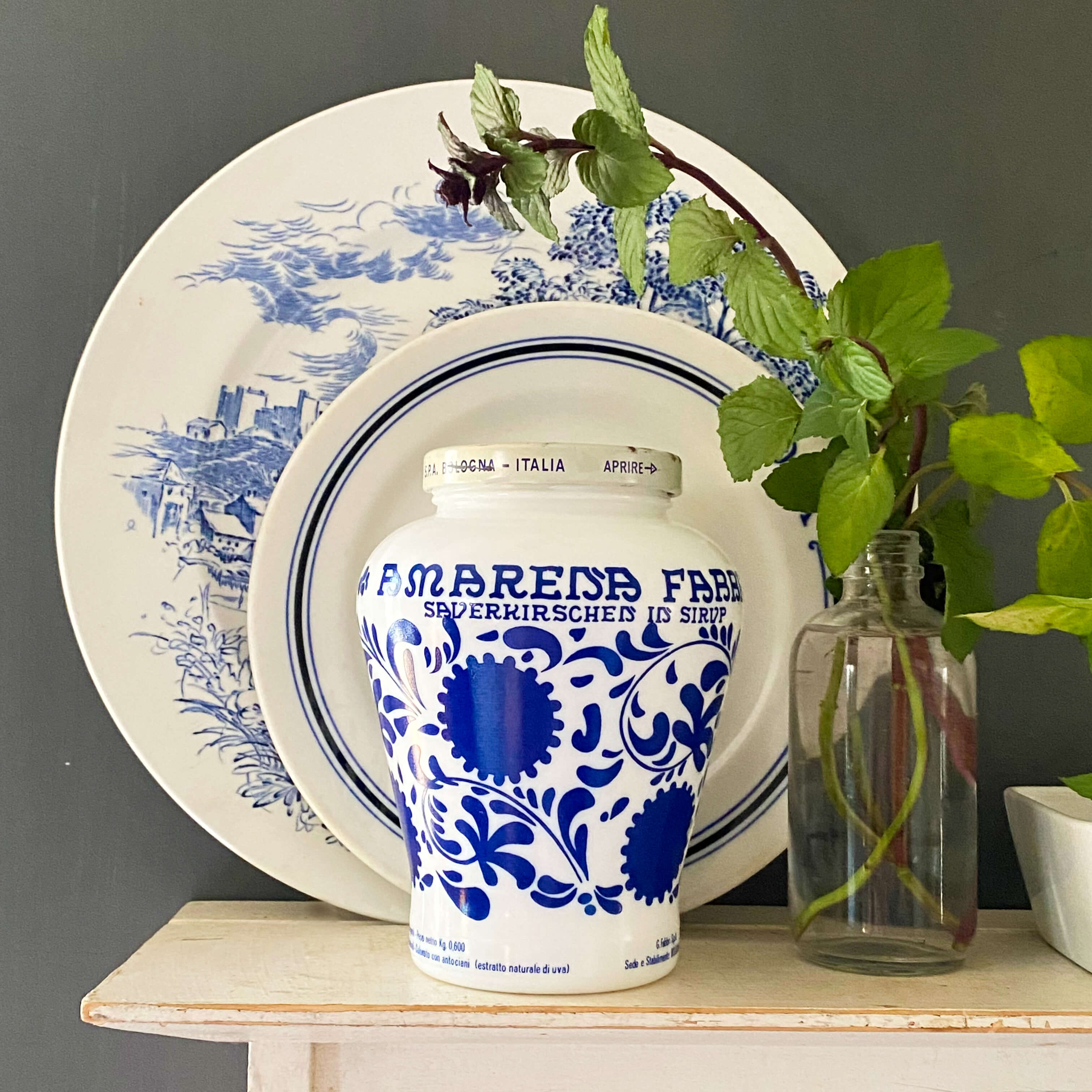 Made of local wild cherries handpicked by Rachele in their hometown of Portomaggiore, Italy, and sweetened with a secret family recipe, Amarena Fabbri has been delighting cooks, bakers, and cocktail creators for generations ever since Gennaro introduced it into his shop in 1915. Uniquely packaged in a petite vase-shaped milk glass jar with blue florals, this design is reminiscent of the original jar that Gennaro presented to Rachele after that exciting first taste.