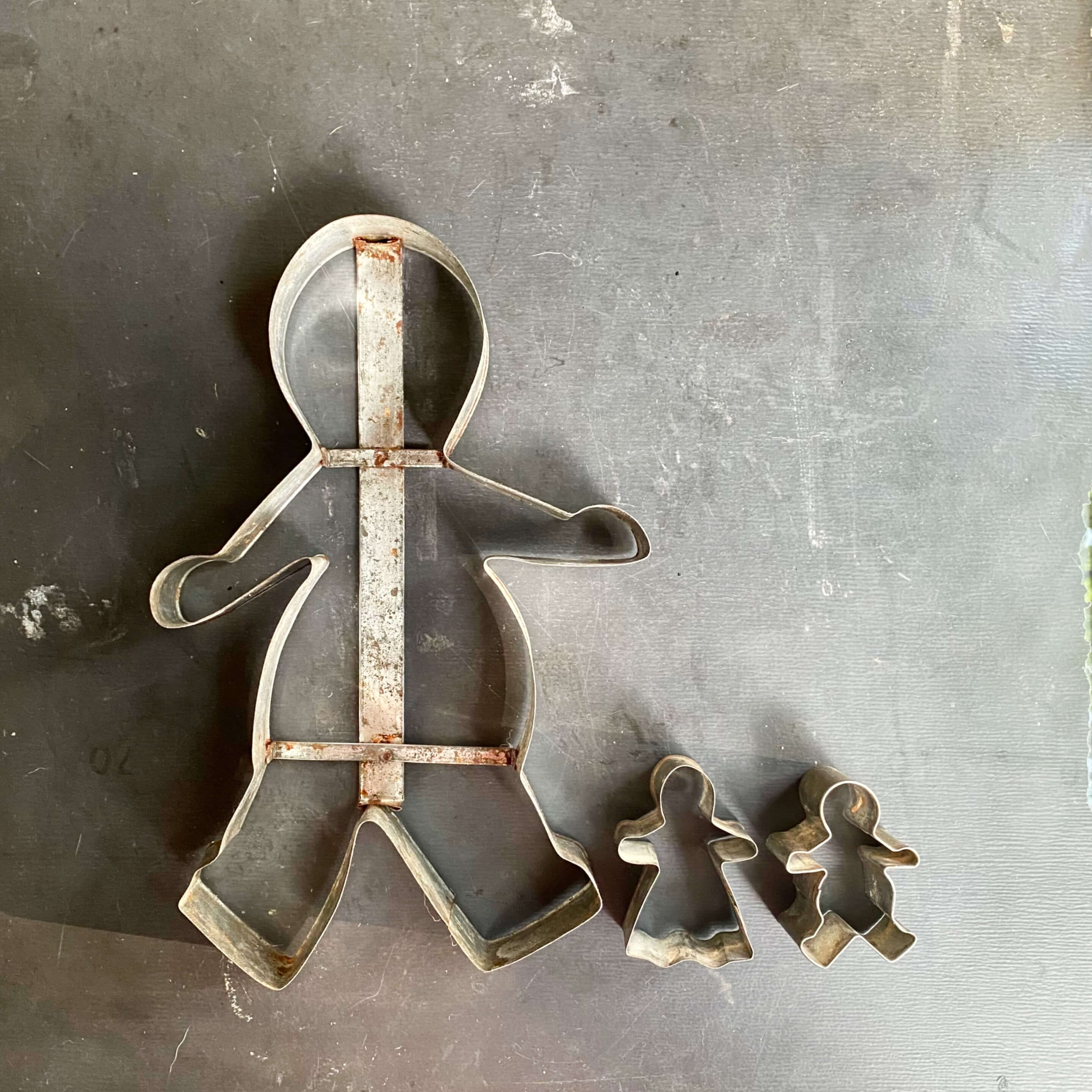All the cookie cutters are in strong and sturdy shape. Clean and well cared for, they each contain varying degrees of tarnish which occurs naturally over time. None of these cookie cutters contain any rust with the exception of a few spots on the giant gingerbread man. Please note the top hole in each of the aluminum cutters where they were once displayed on the wall.