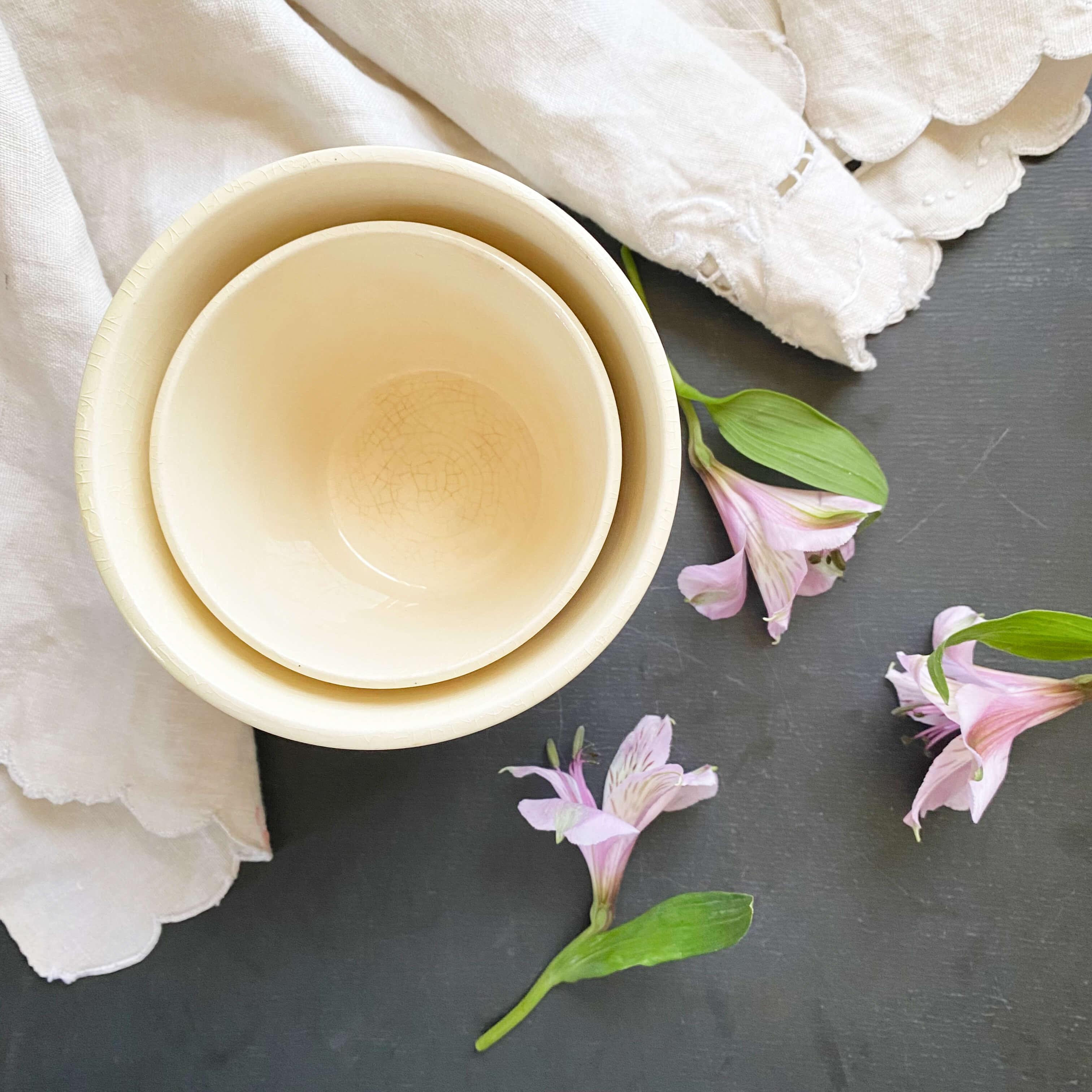 Hard to find in vintage pieces, these cachepots are rare finds when it comes to collecting a specific pattern made by a specific manufacturer. These two are unmarked as to maker, but if we had to guess, we suspect they were produced by Homer Laughlin in the 1930s or early 1940s, as the floral bouquets closely mirror one of their Eggshell Nautilus patterns manufactured in 1939.